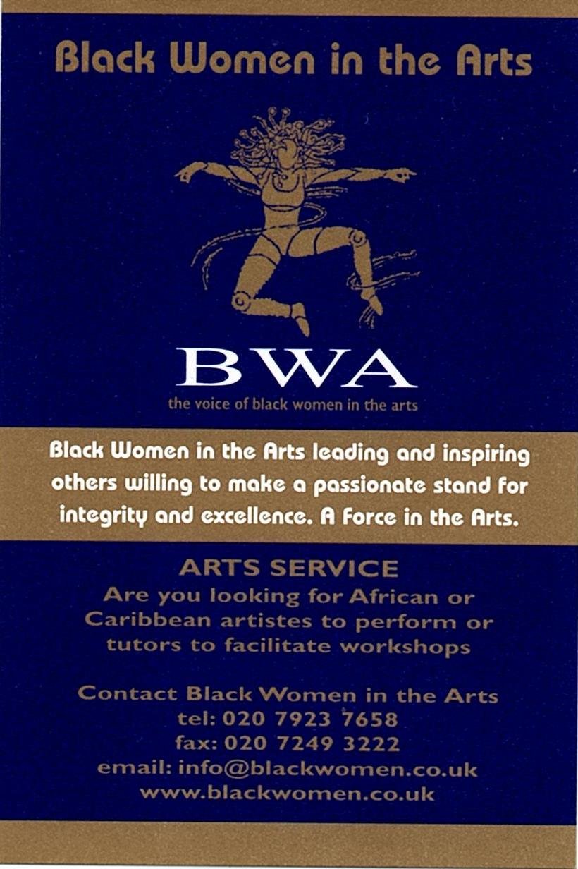First our name Black Women in the Arts well it came from a discussion at one of our meetings that the three founders (Beverley, Chris and Lola) had from 1994 onwards. The first of many meetings that took place at Lola’s in Tottenham. You could say that the organisation was born in Tottenham. Our very first office was in Hackney at the Metropolitan Business Centre, Kingsland Road, London N1 5AZ This logo was designed by one of the founding members (Chris Charles) brother-in-law Frank. It took him several weeks to come up with the logo, but it was well worth the wait, we were delighted with the final design. From 1997 onwards we began using logo and the acronym but were force to remove the ‘I’ from the logo as the acronym resembled the then airline British West Indian Airways