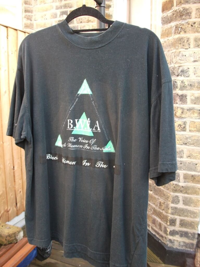 This tee shirt was created around 1998, as a sample of size XL on Egyptian black cotton. It was our intentions to produce more of these tee shirts for sale, but due to lack of funding. Black Women in the Arts did not produce any further tee shirts. So this is the first (one) and only one that was produced and has survived over the past twenty –seven years (27yrs)